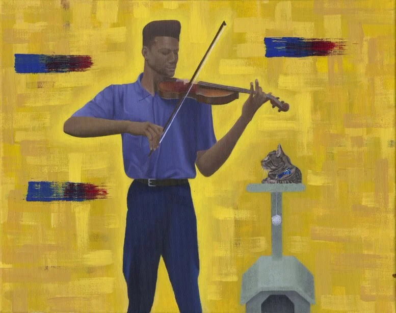 Elijah is playing to my cat Charlie because when he was alive he would play to stray cats on his breaks. This is supposed to represent how Elijah’s story inspired me to fight for the human rights of others.
